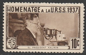 Непочтовая марка: Советский государственный деятель М.И. Калинин, выпущенная "Обществом Друзей СССР" в Испании, ном. 10 сентимо, 1937 год.