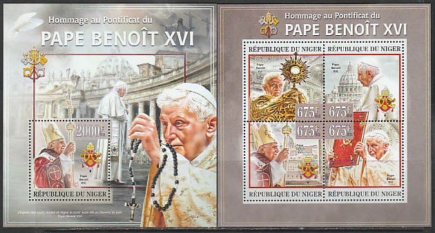 Нигер 2013 год. Папа Римский Бенедикт XVI добровольно покинул престол, малый лист + блок.