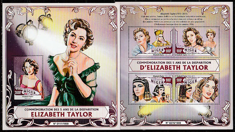 Нигер 2016 год. 5 лет со дня смерти американской актрисы Элизабет Тейлор, малый лист + блок.