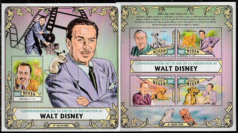 Нигер 2016 год. 50 лет со дня смерти американского художника - мультипликатора Уолта Диснея, малый лист + блок .