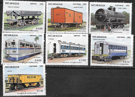 Никарагуа 1983 год. Железнодорожные вагоны. 7 гашеных марок.