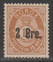 Норвегия 1888 год. Стандарт. Почтовый рожок и корона. НДП нового номинала: 2/12, 1 марка.