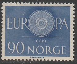Норвегия 1960 год. Европа СЕРТ. Колесо с 19 спицами, 1 марка