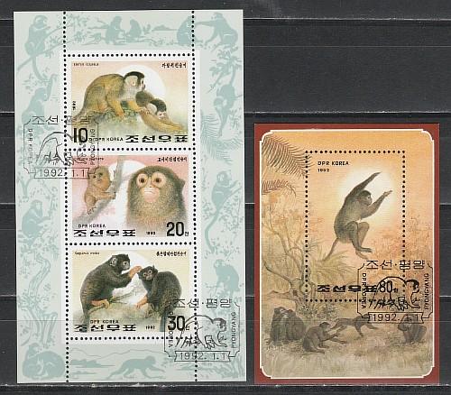 Обезьяны, Спецгашение, КНДР 1992 год, малый лист + блок