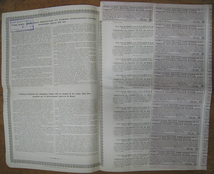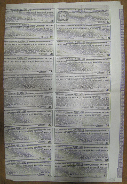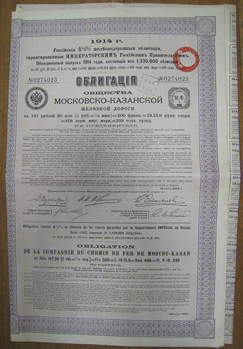 Облигация № 0274023 Общества Московско-Казанской Ж/Д, 1914 год