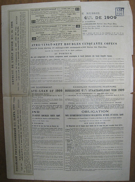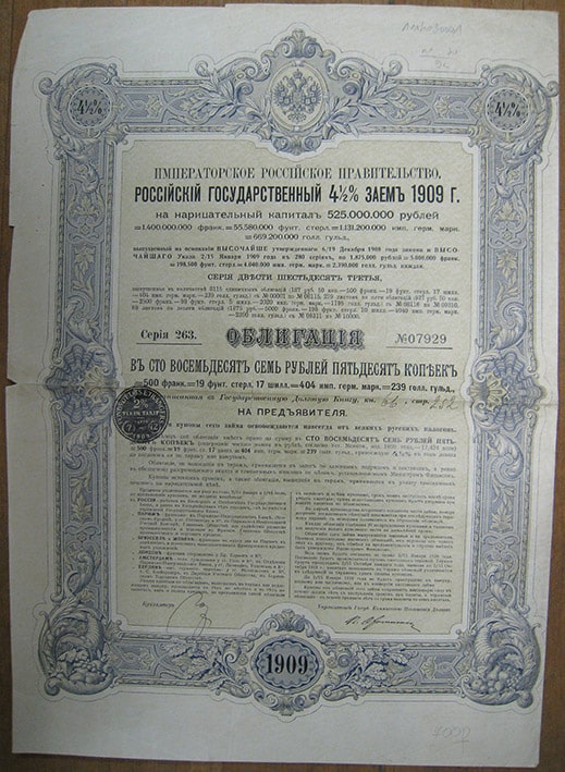 Облигация № 07929 в 187 рублей 50 копеек. Рос. Гос. 5% заем 1906 годаОблигация № 07929 в 187 рублей 50 копеек. Рос. Гос. 5% заем 1906 года