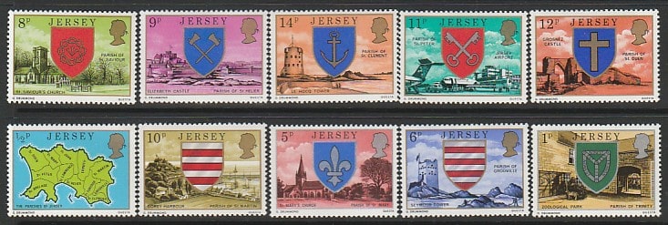Остров Джерси (Великобритания) 1976 год. Города, гербы, геральдика, 10 марок из серии. самолет. корабль