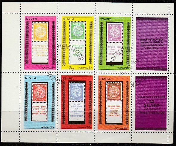 Остров Стаффа (Шотландия) 1974 год. 25 лет почтовой службе Израиля, гашёный малый лист (непочтовые марки)