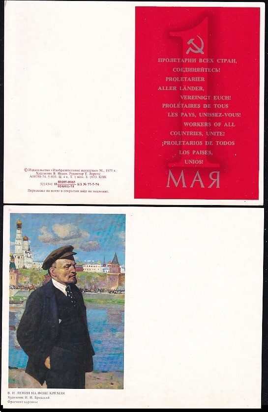 Открытка "1 мая. В. И. Ленин на фоне Кремля". Выпуск 1975 год
