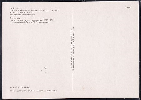 Открытка Ленинград. Костел французского посольства. Выпуск 1988 год