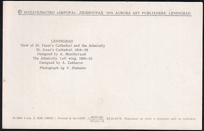 Открытка Ленинград. Вид на Исаакиевский собор и Адмиралтейство. Выпуск 1976 год