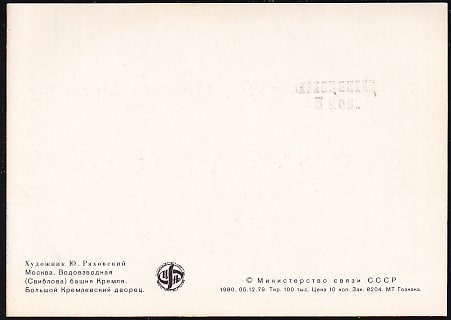Открытка Москва. Водовзводная (Свиблова) башня Кремля. Выпуск 5.12.1979 год, надпечатка о переоценке