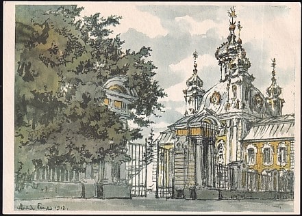 Открытка "А. Н. Бенуа. Петергоф. Центральный корпус Большого дворца". Выпуск 1968 год