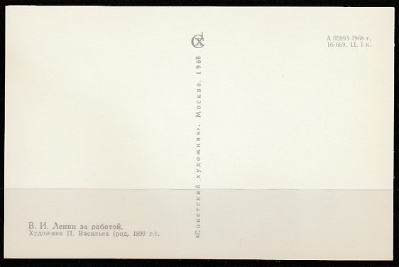 Открытка. Образ вождя в рисунках художника П. Васильева. "В.И. Ленин за работой", "Сх", 1968 год.