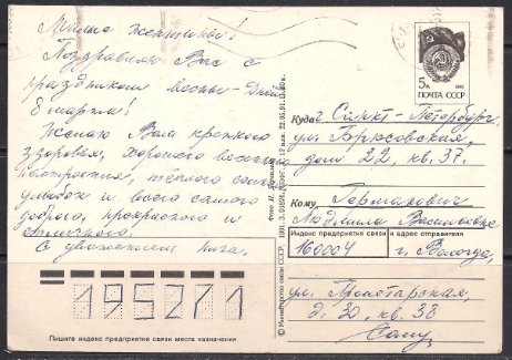 Открытка С праздником 8 марта! Выпуск 22.05.1991 год, прошла почту