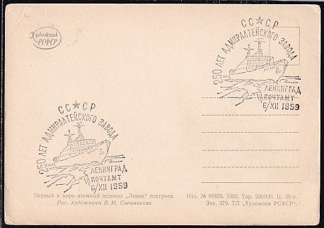 Открытка со спецгашением "250 лет Адмиралтейского завода", 6.12.1959 год, Ленинград