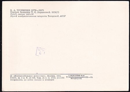 Открытка В.А. Тропинин. Портрет балерины Т.С. Карпаковой. Выпуск 1984 год