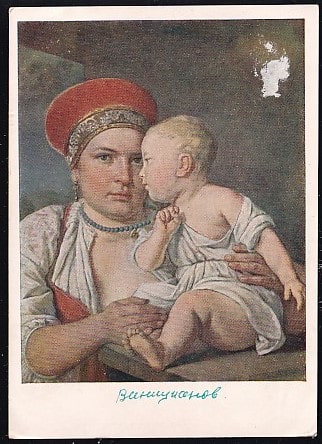 Открытка Венецианов А.Г. Кормилица с ребенком. Выпуск 1956 год (надпечатка, надписана, следы клея)