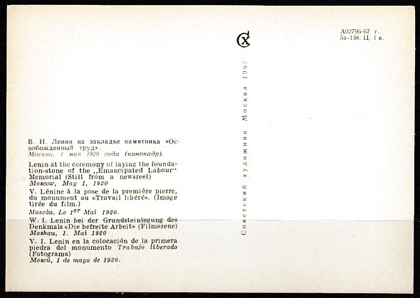 Открытка. В.И. Ленин на закладке памятника "Освобождённый труд", "Советский художник", 1967 год.