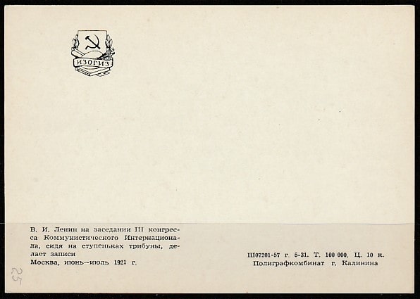 Открытка. В.И. Ленин на заседании III конгресса Коминтерна, фото, "ИЗОГИЗ", 1957 год.