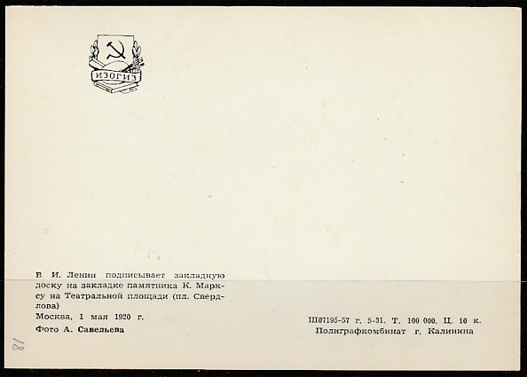 Открытка. В.И. Ленин подписывает закладную доску к памятнику К. Марксу (фото А. Савельева), "ИЗОГИЗ", 1957 год.