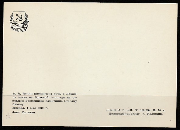 Открытка. В.И. Ленин произносит речь на Красной площади (фото Госкино), "ИЗОГИЗ", 1957 год.