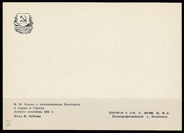 Открытка. В.И. Ленин с племянником Виктором (фото В. Лабоды), "ИЗОГИЗ", 1957 год.