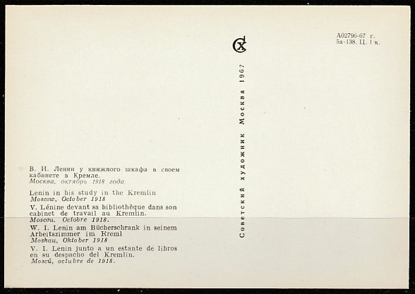 Открытка. В.И. Ленин у книжного шкафа в Кремле, "Советский художник", 1967 год.