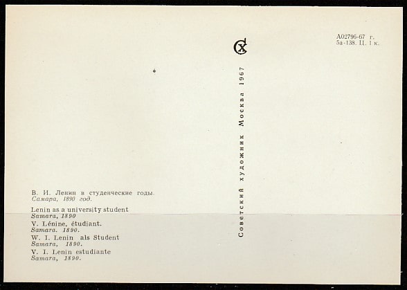 Открытка. В.И. Ленин в студенческие годы, "Советский художник", 1967 год.