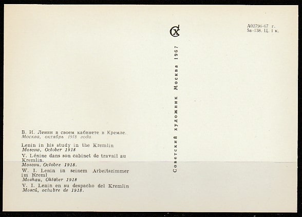 Открытка. В.И. Ленин в своём кабинете в Кремле, "Советский художник", 1967 год.