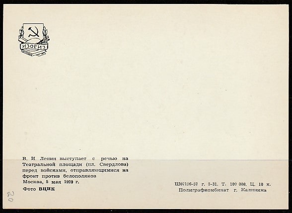 Открытка. В.И. Ленин выступает с речью на площади Свердлова (фото ВЦИК), "ИЗОГИЗ", 1957 год.