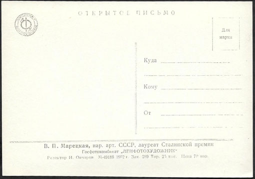 Открытое письмо артистка В.П. Марецкая