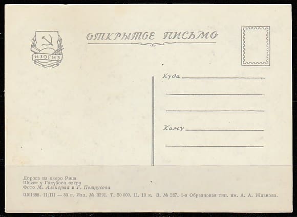 Открытое письмо. Дорога на озеро Рица. Шоссе у Голубого озера, 11.03.1955 год, "ИЗОГИЗ".