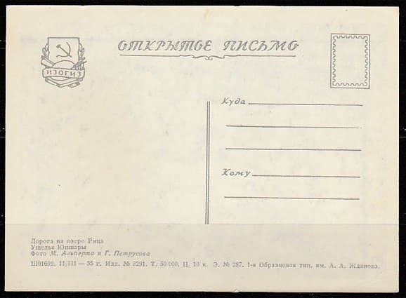 Открытое письмо. Дорога на озеро Рица. Ущелье Юпшары, 11.03.1955 год, "ИЗОГИЗ" (II)