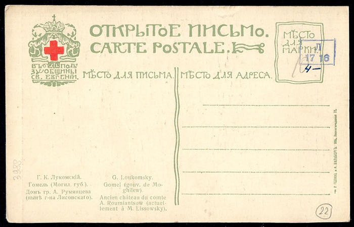 Открытое письмо. Художник Лукомский. Гомель. Дом гр. А. Румянцева. 1914 г.
