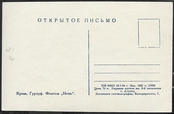 Открытое письмо. Крым. Гурзуф. Фонтан Ночь, 18.01.1954 год