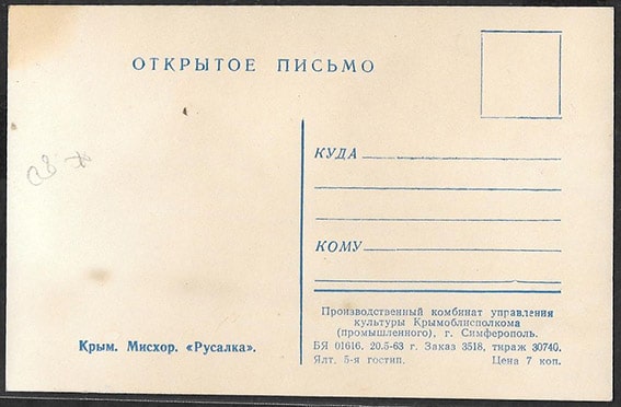 Открытое письмо. Крым. Мисхор. Русалка, 1963 год