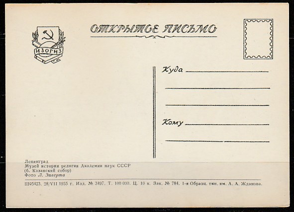 Открытое письмо. Ленинград. Казанский собор, 28.07.1955 год, "ИЗОГИЗ".