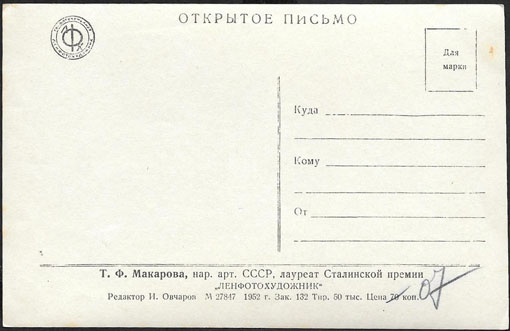 Открытое письмо. Народная артиска Т.Ф. Макарова. 1952 год. Лауреат Сталинской премии