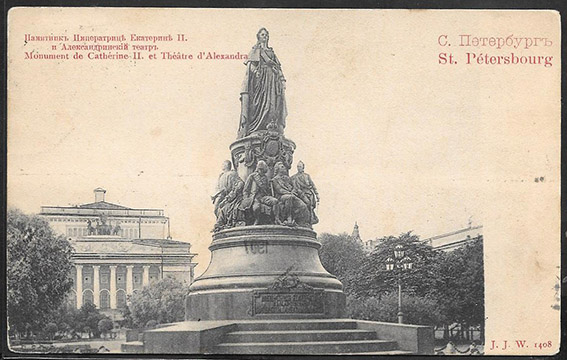 Открытое письмо. П.п. 1907 год. С. Петербург. Памятник Императрице Екатерине II и Александрийский театр