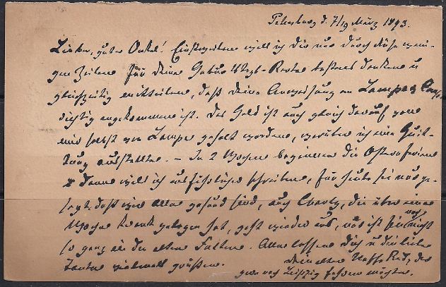 Открытое письмо. Россия 1893 год, прошло почту, погашено номерным штемпелем (ю)
