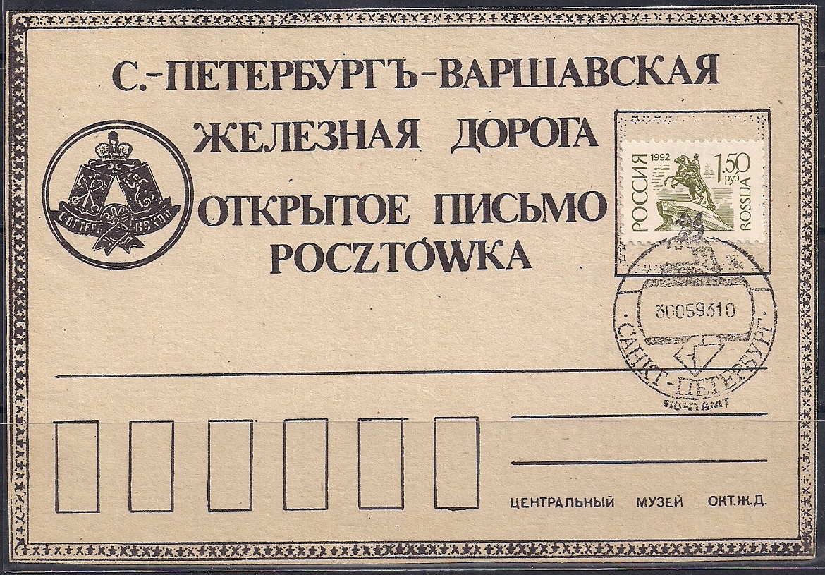 Открытое письмо со спецгашением. Санкт-Петербург-Варшавская железная дорога, 30.05.1993 Санкт-Петербург почтамт