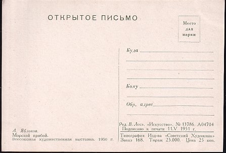 Открытое письмо "А. Яблоков. Морской прибой." Выпуск 11.05.1951 год