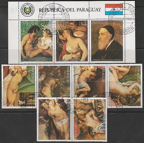 Парагвай 1986 год. Картины в стиле ню, 7 марок + 2 купона (гашёные) (II)