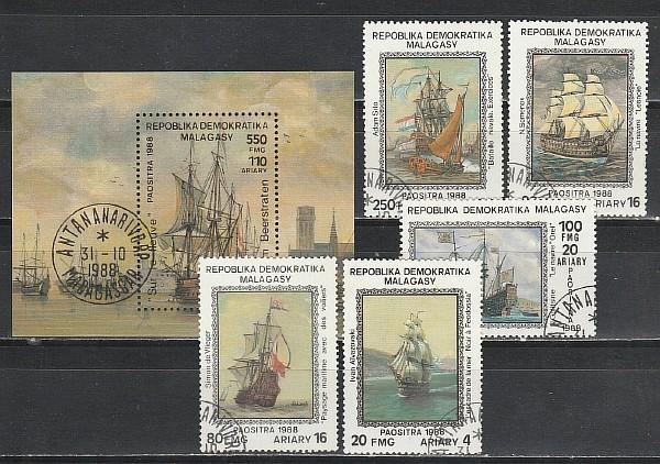Парусные Корабли, Мадагаскар 1988 год, 5 гашеных марок + блок .