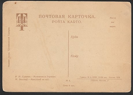 ПК 1928 год. Картина Третьяковской галереи, В.И. Суриков "Меншиков в Берёзове"