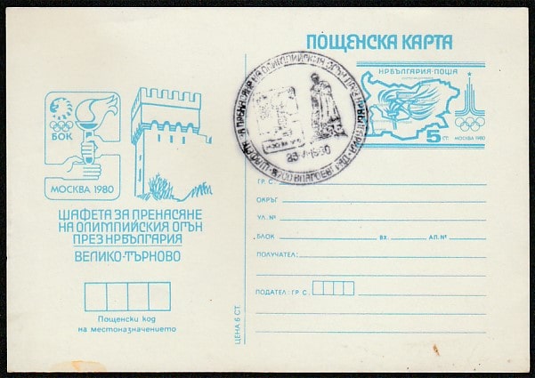 ПК Болгарии. Эстафета Олимпийского огня через Болгарию. Велико-Тырново, спецгашение, 1980 год.