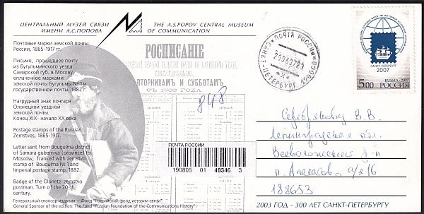 ПК "Центральный музей связи им А.С. Попова. Почтовые марки земской почты", 2007 год, прошел почту (ВВ)