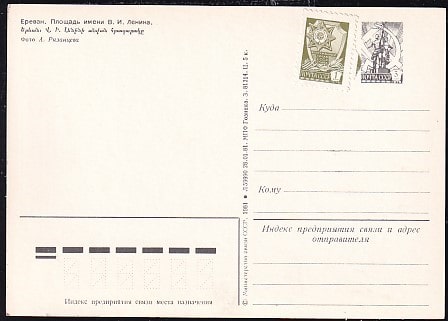 ПК Ереван. Площадь им. В.И. Ленина (наклеена марка 1 коп). Выпуск 28.01.1981 год