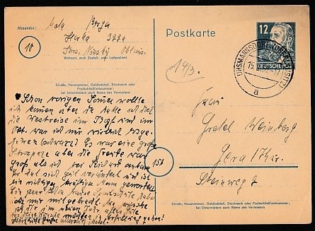 ПК ФРГ, прошла почту, гашение 15.02.1950 год, Усмансдорф